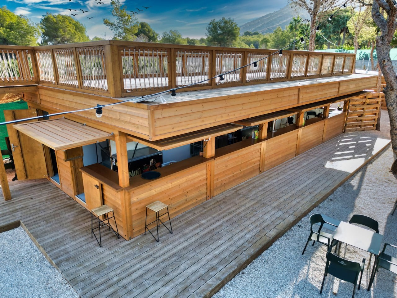 Para completar la experiencia, la cafetería con terraza ofrece un espacio de descanso integrado en los jardines, rodeado de arboleda y con vistas privilegiadas. Un lugar pensado para disfrutar de comida saludable, música suave y una atmósfera de calma y bienestar, siempre en armonía con el paisaje natural.